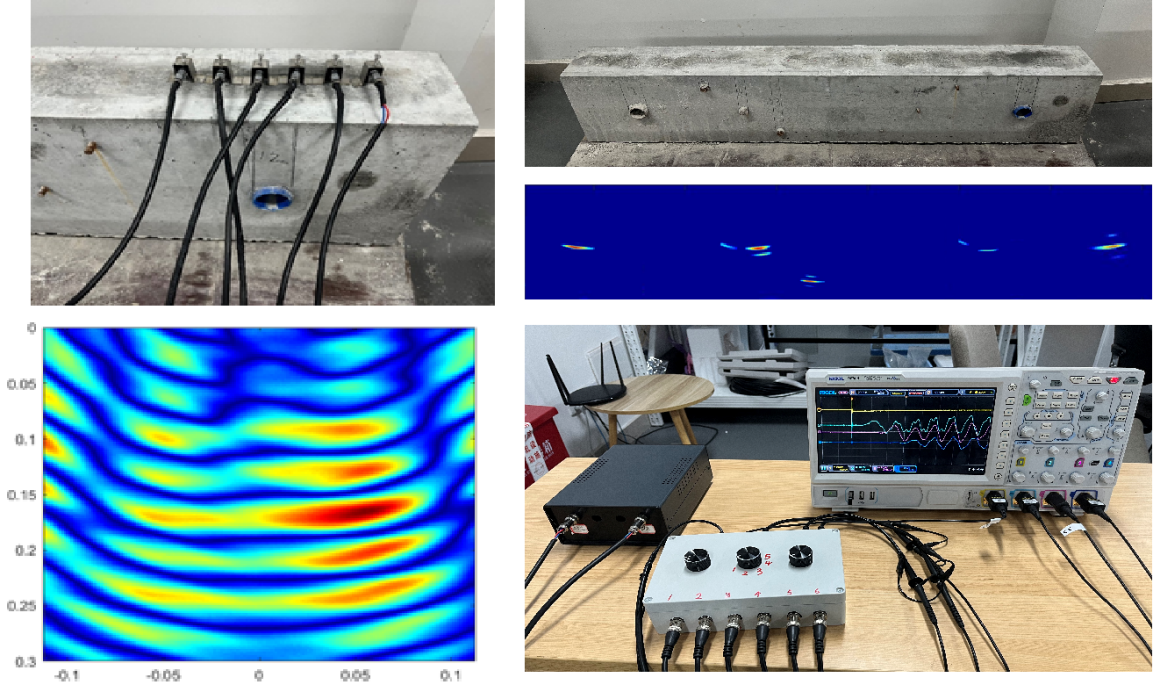 无损检测是发现安全隐患最直接、最有效的方法之一,其最大特点是不会损坏被测物体,且灵敏度高,可以检测肉眼无法观察到的小缺陷和内部缺陷。研发室通过项目研发引进了俄罗斯的干耦合技术,开发了干耦合探头,并自主研发了岩石损伤扩展超声监测技术,提出了测速算法,开发了相关程序,提升了现有岩石力学试验的测试水平。相关技术已写入了中国工程建筑标准化协会编写的2021 版《冲击应力波法检测混凝土缺陷技术规程》及《桥梁预应力孔道注浆密实度无损检测技术规程》中,目前正与本地企业碧桂园合作,联合研究构件的超声波阵列监测、岩石损伤各向异性等课题工作。