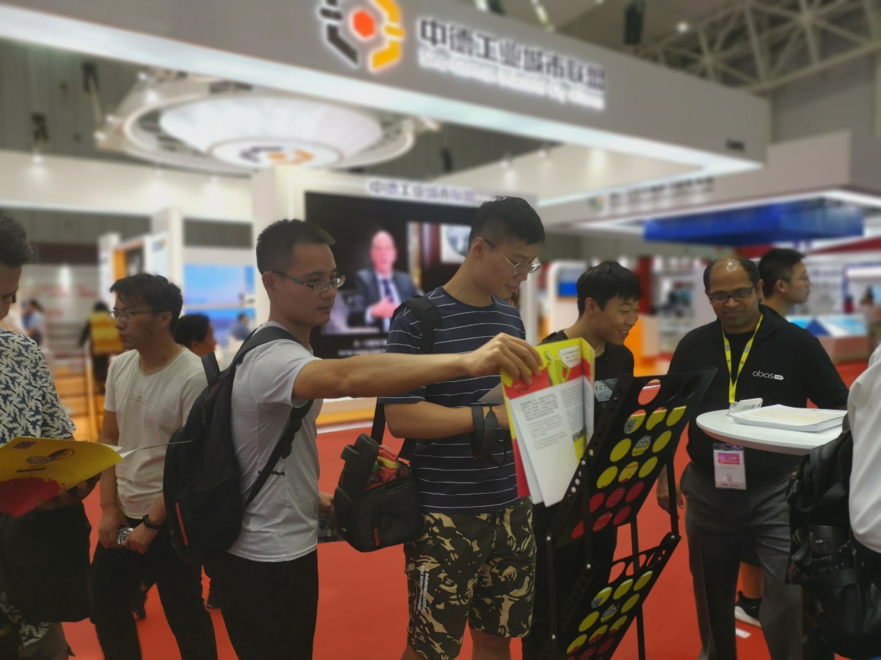 图为2号展馆德国abas展位,同学们在收集企业相关资料