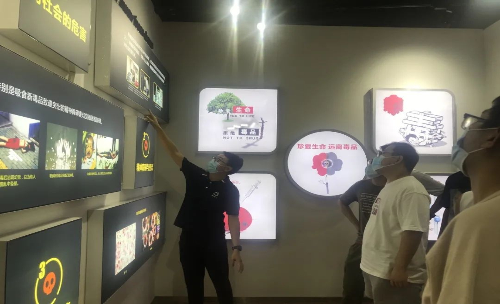 随后,大家来到南华社区禁毒教育基地参观。经过现场讲解员的详细介绍和基地内禁毒知识展厅、禁毒微视频、体验触控屏幕知识问答,大家对禁毒、识毒和拒毒有了更加深刻的认识,加深了对“珍爱生命,远离毒品”这句话的理解。